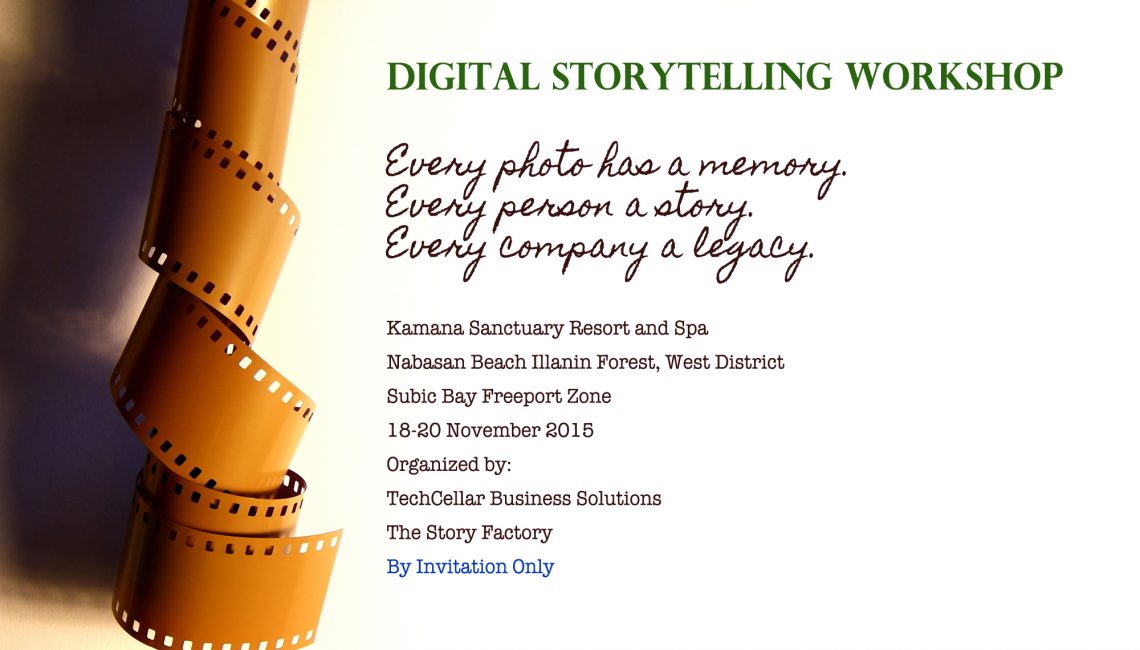 The Story Factory will facilitate a Digital Storytelling Workshop in Kamana Sanctuary Resort and Spa (Subic, Philippines) together with TechCellar Business Solutions, 18-20 November 2015. Digital storytelling is the telling of stories using multi-media tools. The three-day workshop will help the participants choose and craft their stories, write them into a script to read and … Continue reading “Digital Storytelling Workshop in Subic”