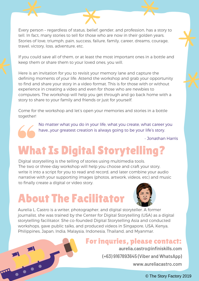 Here is an invitation for you to revisit your memory lane and capture the defining moments of your life. Attend the workshop and grab your opportunity to find and share your story in a video format. This is for those with or without experience in creating a video and even for those who are newbies to computers. The workshop will help you get through and go back home with a story to share to your family and friends or just for yourself.